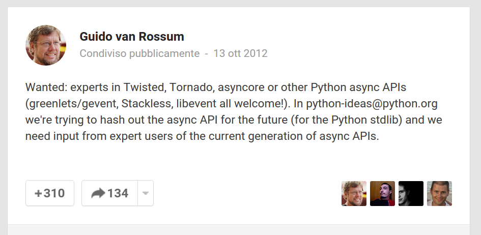 Interoperable with "legacy" async libraries by sharing / adapting event loops (with tornado, twisted, libevent..)